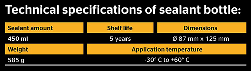 The tire sealant is pumped by the Continental compressor into the tire, enabling the onward journey to the nearest garage or tire service (max. 80 km/h and max. 200 km). It seals car tire punctures caused by nails or similar objects with a diameter of up to 6 mm.
